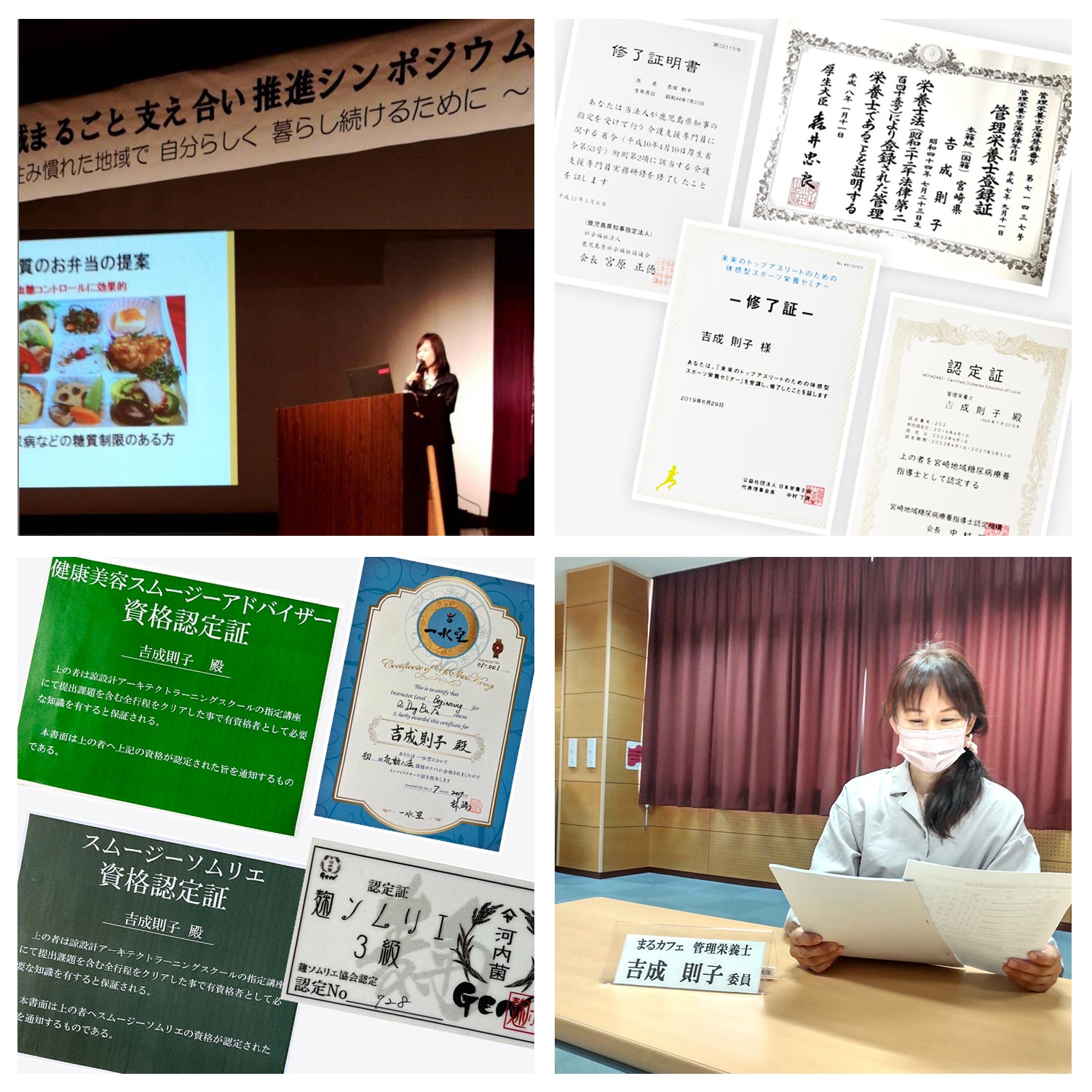 資格は、管理栄養士以外にも、介護支援専門員、宮崎県糖尿病療養士、麹ソムリエ、スムージーソムリエ、健康美容スムージーアドバイザー、一水空気道八法インストラクターなど。
